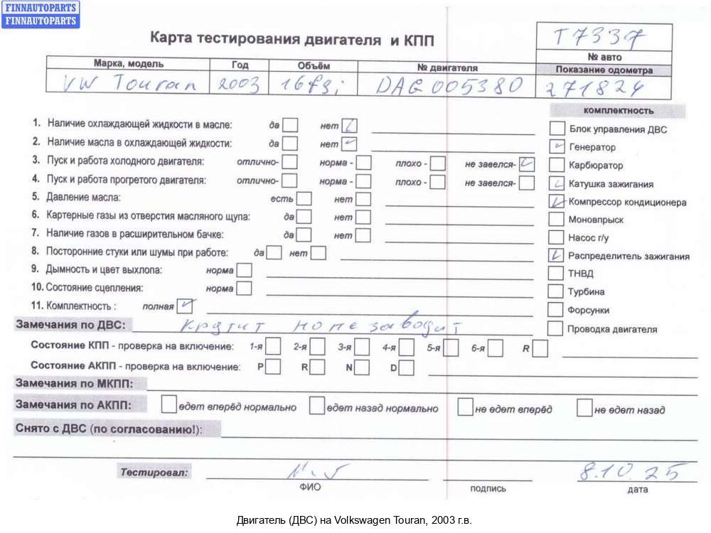 | Ярославль | 2006 | 06F100034E, 2006, 2л, Бензин, FSI, BVY, BVY063169, 06F100034E, Минивэн, черный, Фото не актуально, с запчасти отделены: Генератор, BVY063169 | - | К | Т | КК, состояние ГРМ - нормально, поддон - нормально, клапанная крышка - нормально, | |||